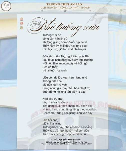 “ Nhớ trường xưa" - không phải những lời hoa mỹ, cũng chẳng cần câu từ cầu kỳ, chỉ đơn giản là dòng cảm xúc chân thành được viết nên từ trái tim của người học trò xưa - tiến sĩ Nguyễn Trung Anh, nguyên giảng viên Đại học Thủy Lợi Hà Nội - người đã từng đi qua thanh xuân dưới mái trường THPT An Lão.