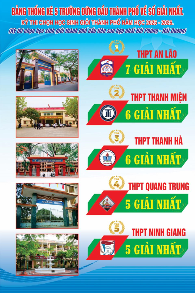 Xin chúc mừng tất cả các em! Chúc mừng các thầy cô giáo lãnh đội đã tận tâm dìu dắt! Các em chính là động lực để thế hệ tiếp nối viết tiếp những trang sử vàng của nhà trường. Trường THPT An Lão cũng xin được chúc mừng các trường có 6 giải nhất, 5 giải nhất cùng đứng trong Top 5 trường THPT có số lượng giải nhất cao toàn thành phố.