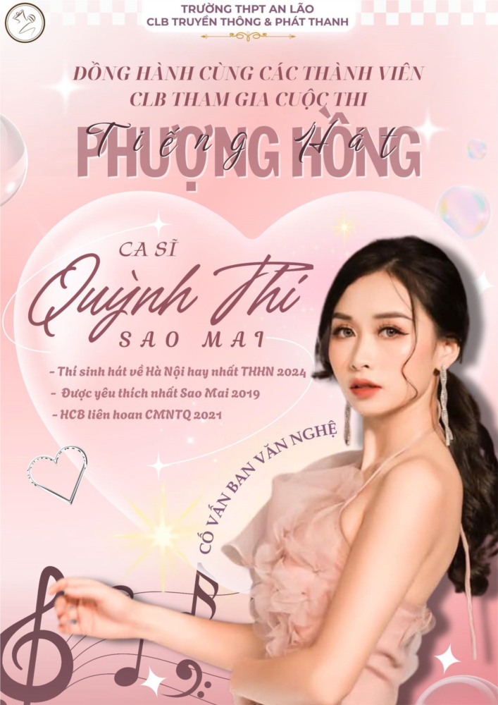 Đặc biệt, các thành viên tham gia cuộc thi lần này vinh hạnh nhận được sự hỗ trợ tận tình, nhiệt huyết từ ca sĩ Quỳnh Thi - cựu học sinh Trường THPT An Lão - Cố vấn ban Văn nghệ với nhiều thành tích nổi bật: đoạt HCB liên hoan CMNTQ 2021, được yêu thích nhất Sao Mai 2019, thí sinh hát về Hà Nội hay nhất THHN 2024,...