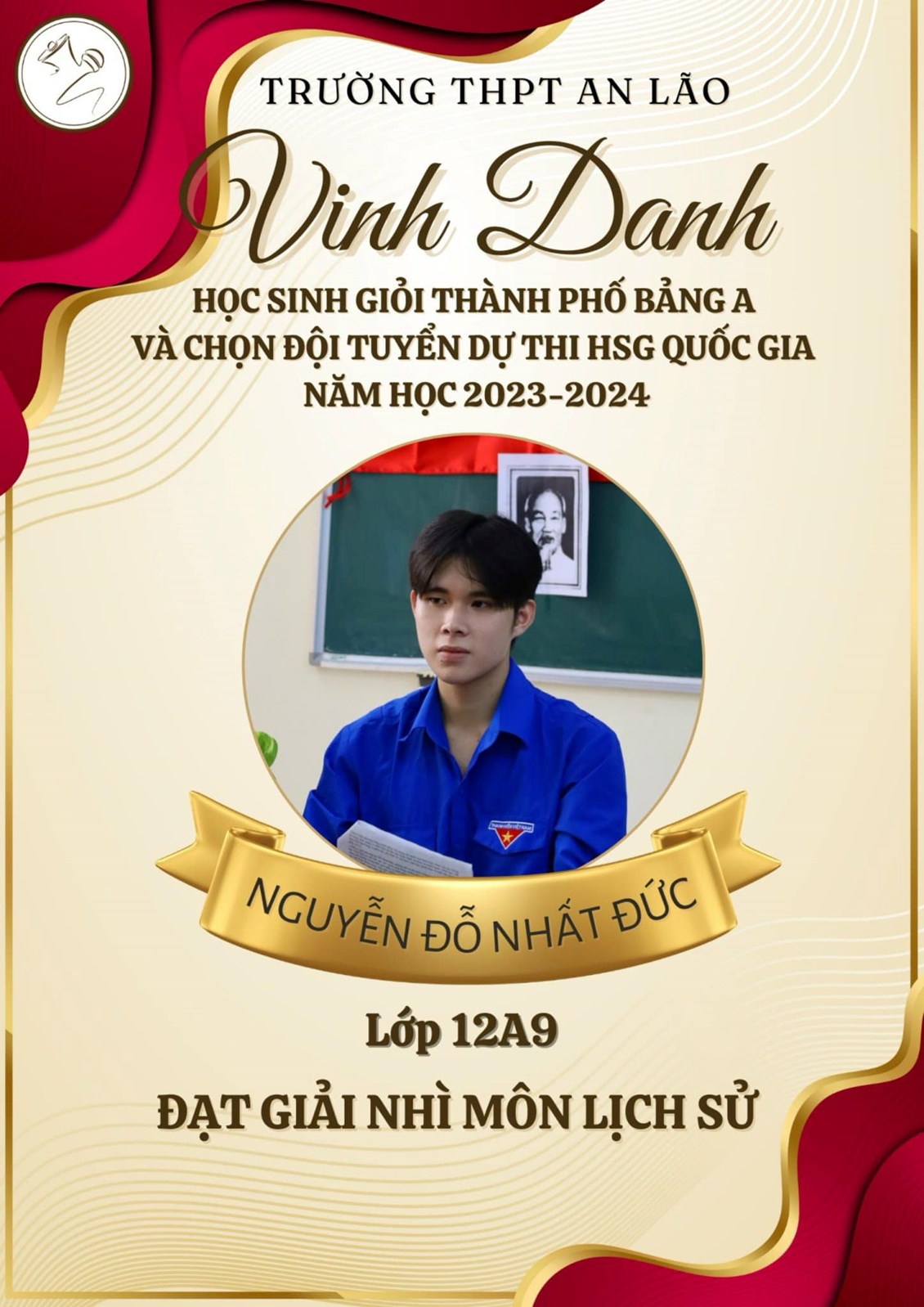 Trong kì thi chọn HSG Thành phố Bảng A năm học 2023 - 2024, Trường THPT An Lão rất vui mừng và tự hào về những "trái ngọt đầu mùa" của năm học mới với 1 giải nhì, 2 giải ba, 7 giải KK. Trong đó, em NGUYỄN ĐỖ NHẤT ĐỨC lớp 12A9 đạt GIẢI NHÌ môn Lịch sử đã được lọt vào đội tuyển tham gia dự kì thi HSG Quốc gia năm học 2023 - 2024.